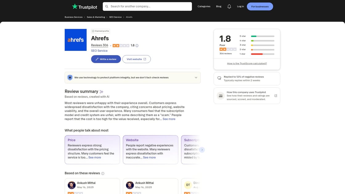 - Ahrefs' 2.1/5 Trustpilot rating is driven by credit limit suspensions and billing, not data quality