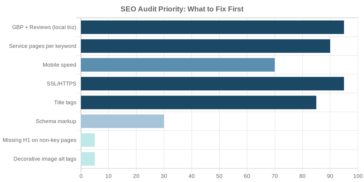 A dental practice in Surrey had a page speed score of 38 on mobile. The audit tool flagged it as critical. But when we looked at their actual traffic data, patients were finding them through Google Maps (where page speed doesn't matter) and converting via phone call (where load time is irrelevant because they never saw the website). We fixed the speed issue because it was easy, but the real problem was zero content targeting treatment keywords. The speed fix moved nothing. The content did.