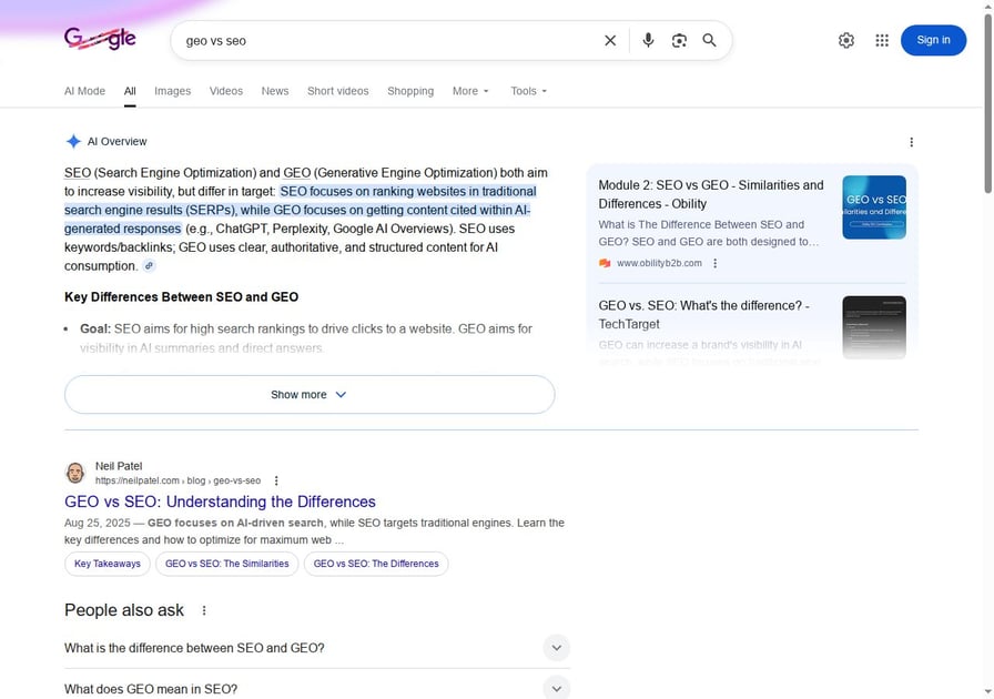 Search "geo vs seo" on Google right now, and you'll see exactly what this looks like: