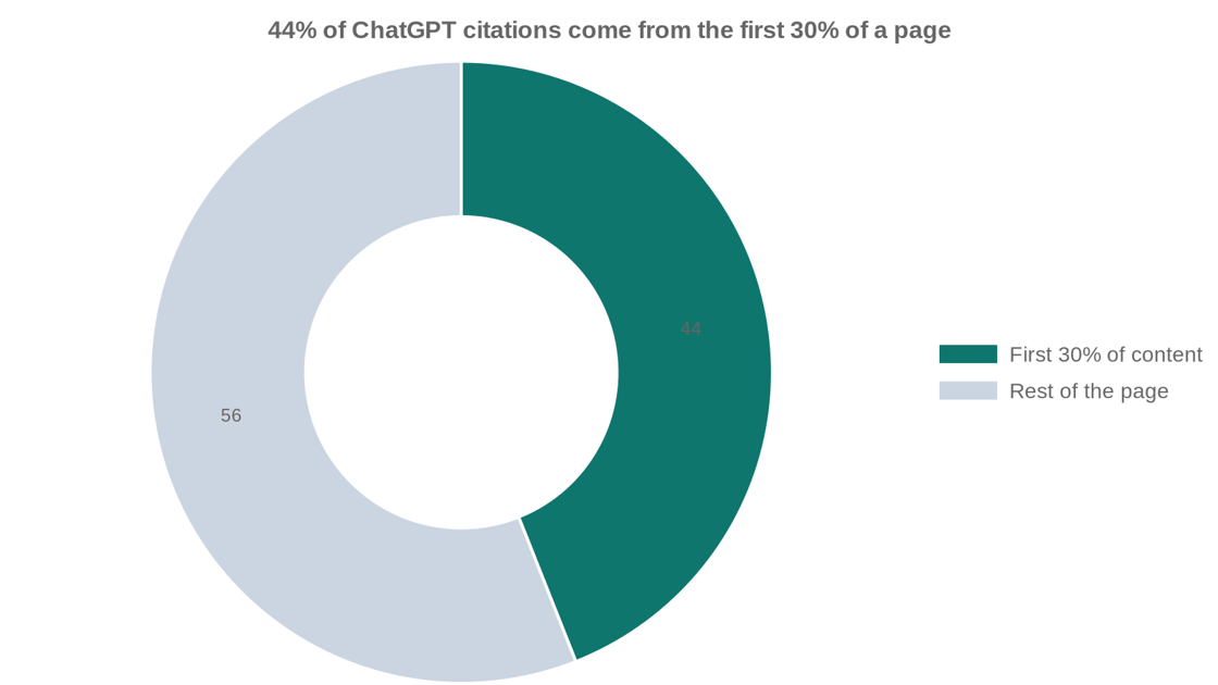 - 44% of ChatGPT citations come from the first 30% of a page (Kevin Indig study) - lead with the answer in your first 40-60 words.