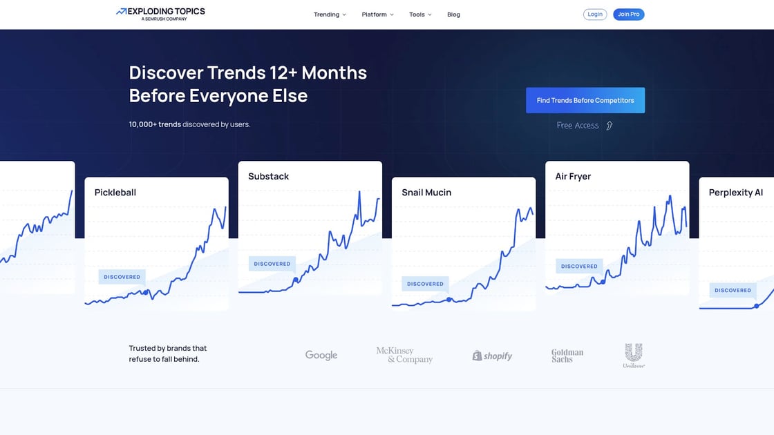Trending topics before they peak. Exploding Topics identifies search trends 12+ months before they become competitive. If you can publish comprehensive content on a trending topic before the big sites notice it, you'll rank with almost zero competition.