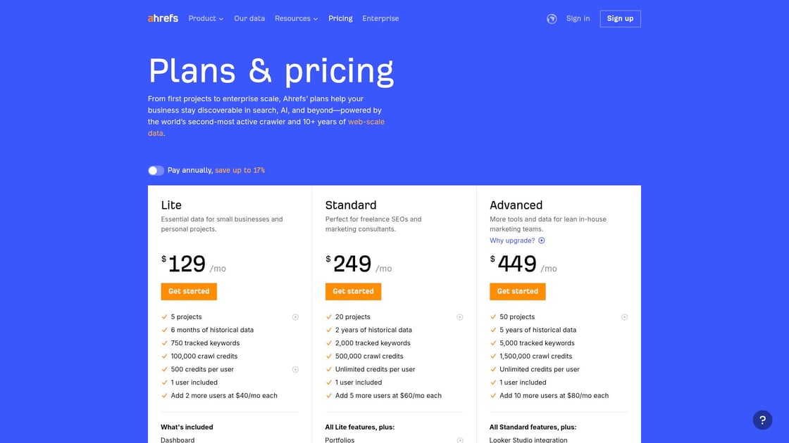 Ahrefs' Lite plan limits you to 500 credits per month and tracks five websites. It is genuinely limited for agency use. Semrush's Pro plan is slightly more generous on reports but lacks historical data depth.