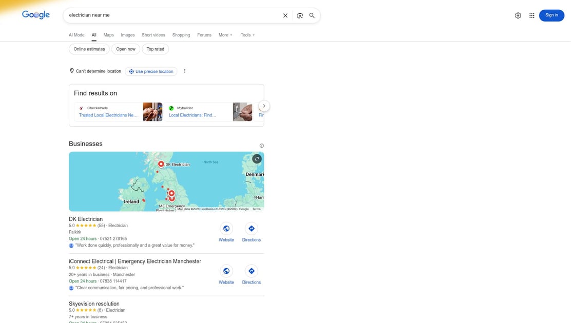 Your GBP is where most local electrical enquiries come from. The map pack appears above organic results for every "electrician near me" and "[service] [town]" search.
