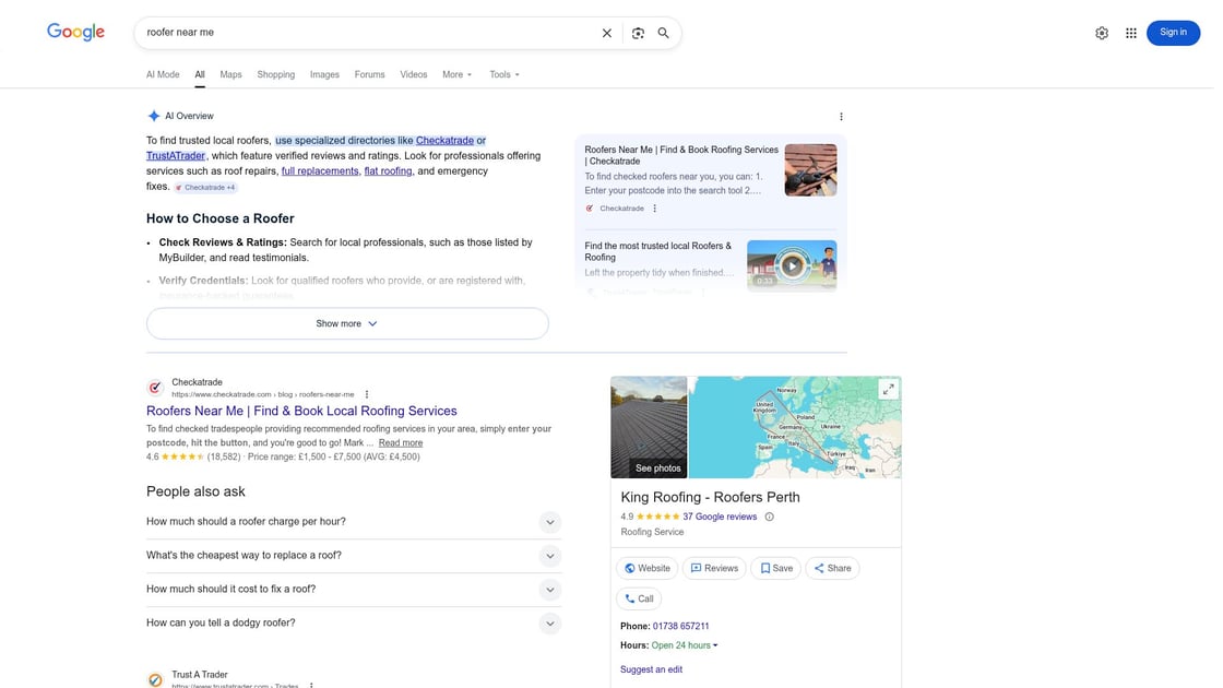 Step 1 - the search. They type "roofer near me" or "roof repair [town]". Google shows a map pack with three businesses, then organic results, then sometimes Checkatrade or MyBuilder listings. If you're not in the map pack or the first few organic results, you don't exist for this person.