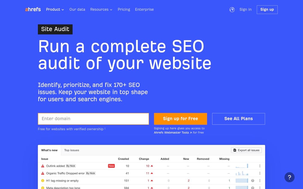Set up a project in Ahrefs and run a full SEO site audit. Focus on the Health Score and the "Critical" issues first - broken links, redirect chains, missing meta, duplicate titles. This is your site audit SEO snapshot. Export the issues list.