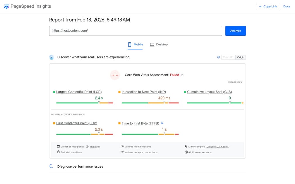 Nestcontent.com's mobile CWV report: LCP and CLS pass, but INP at 420ms is above the 200ms threshold. A real example of a site that passes two metrics and fails one.