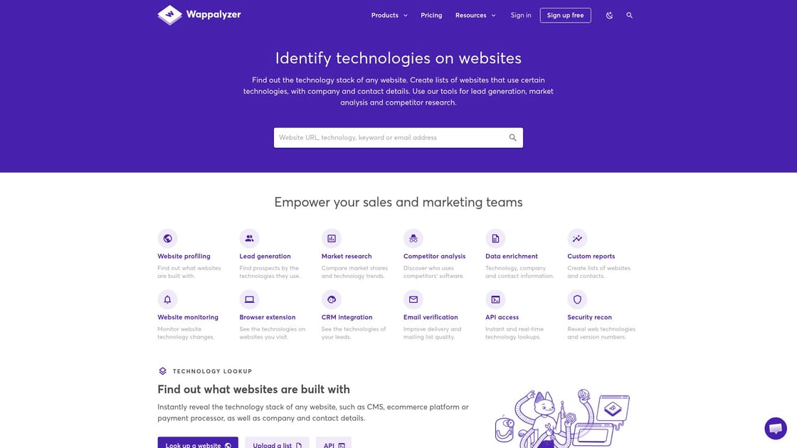 Free tier: Identifies technologies on any page you visit. Paid plans add bulk lookups and lead generation features.