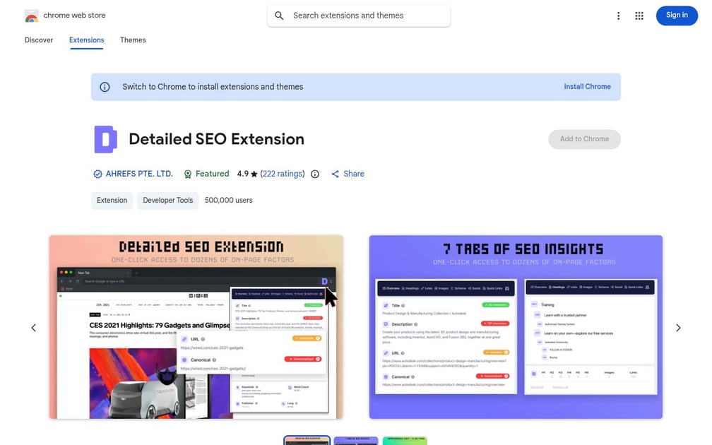 If you install one SEO extension, make it this one. Detailed SEO Extension gives you instant access to any page's title tag, meta description, URL structure, canonical tag, robots directives, heading hierarchy, schema markup, and Open Graph tags. One click, everything visible.