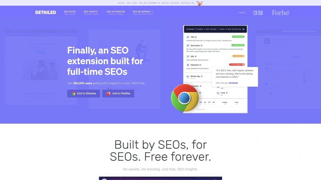 It's free, has 450,000+ users, and it's built by Glen Allsopp from Detailed.com - an actual SEO practitioner, not a company trying to upsell you into a $99/month subscription. The data is clean, the interface is fast, and it doesn't inject anything into the page you're viewing.